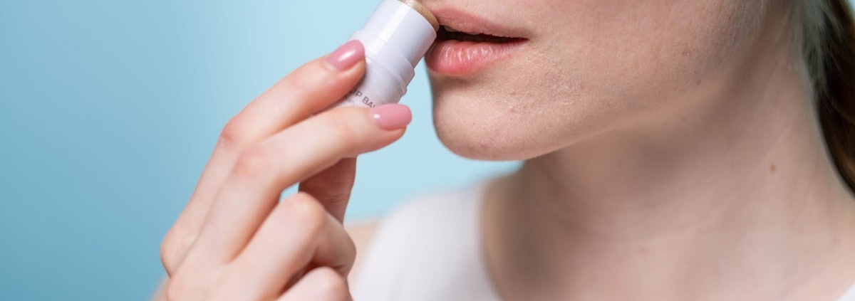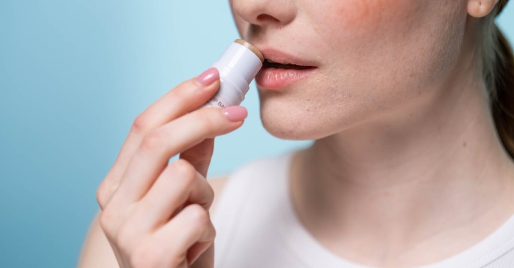 A woman applying lip balm to her lips, highlighting skincare and self-care routine.